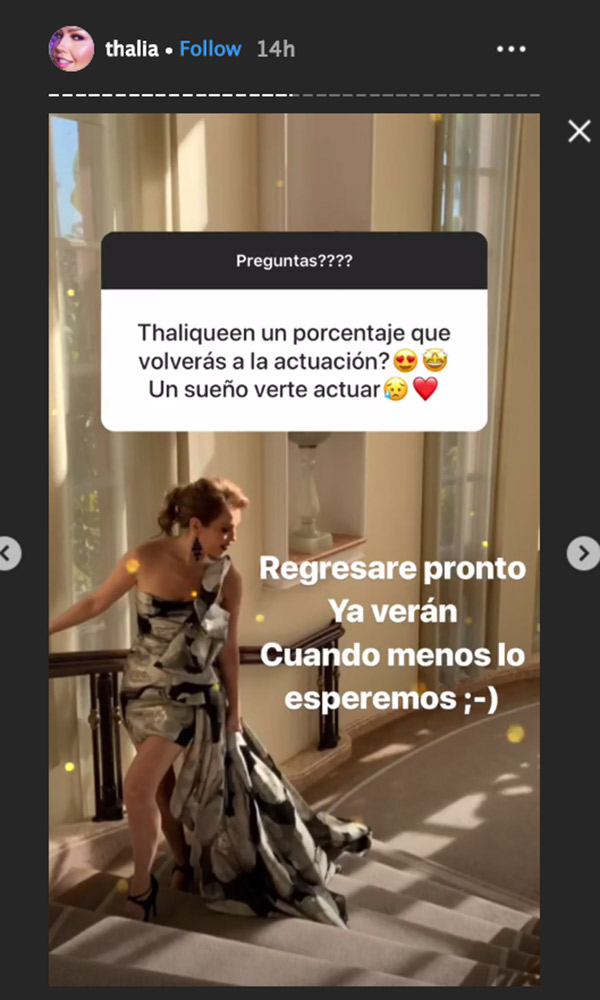 Ao menos Thalía respondeu a uma pergunta em seu perfil no Instagram dando a entender que sim. “Regressarei em breve, vão ver, quando menos esperarem”, respondeu num stories.